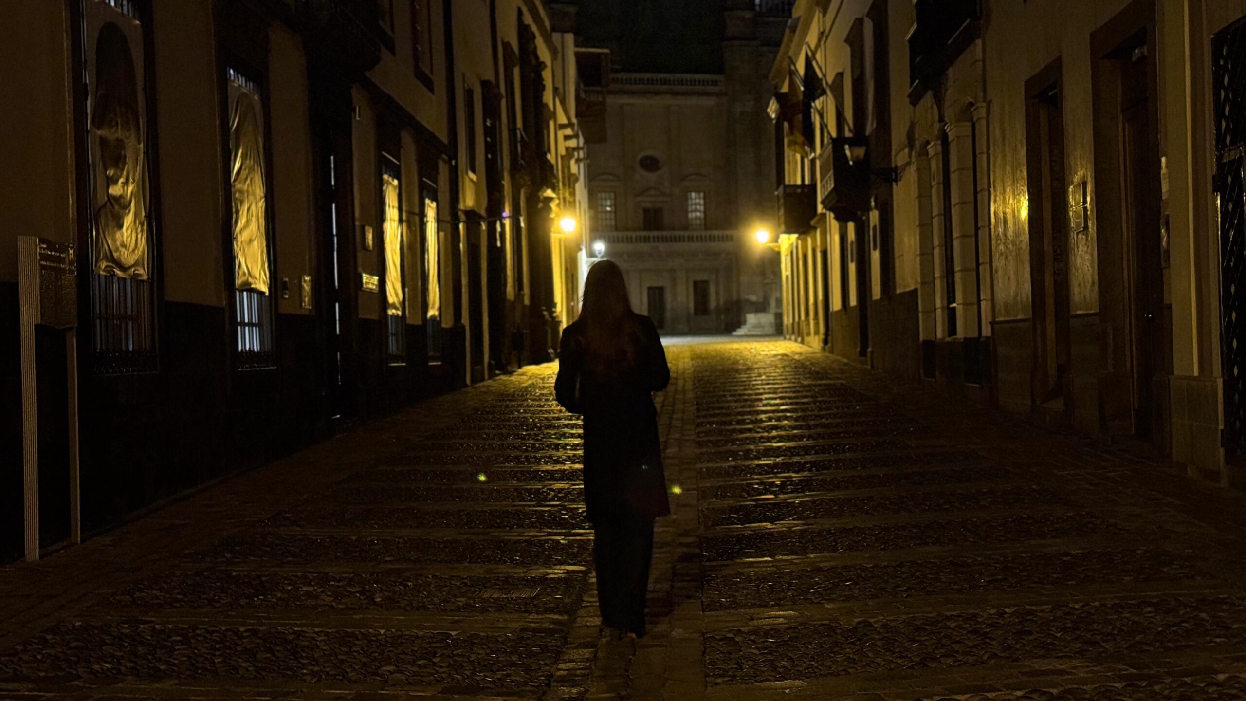 Mujer caminando por la calle de noche. Foto: A. Guillén
