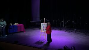 Durante todo el evento, la pintora Carmen Milagros Hernández Bencomo, también profesora de Secundaria y Bachillerato en el Colegio Pureza de María, estuvo pintando un cuadro que nos mostró al final. Una obra donde se dejó llevar por sus gustos, inspiraciones y pensamientos del momento. Finalmente, explicó que se había decidido a pintar una mujer junto a un drago, el mismo drago emblemático que se cayó en el municipio el pasado 5 de marzo, muy especial para todos los realejeros.