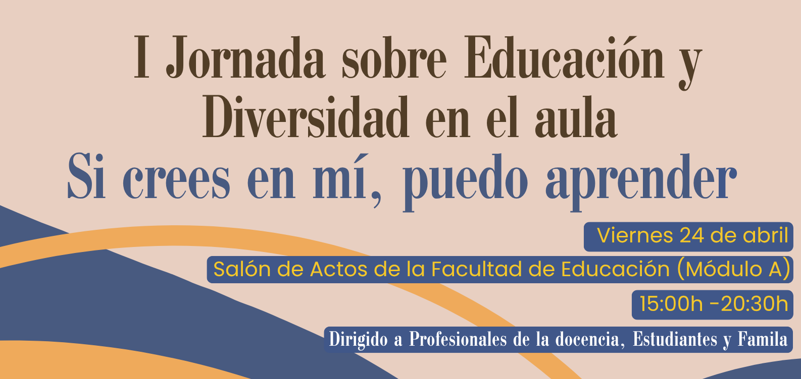 La Facultad de Educación de la Universidad de La Laguna acogerá mañana viernes, 24 de abril, de 15.00 a 20.30 horas, la I Jornada sobre Educación y Diversidad en el aula , bajo el lema «Si crees en mí, puedo aprender». La actividad se celebrará en el salón de actos del módulo A y está dirigida a profesionales de la docencia, estudiantes y familias.