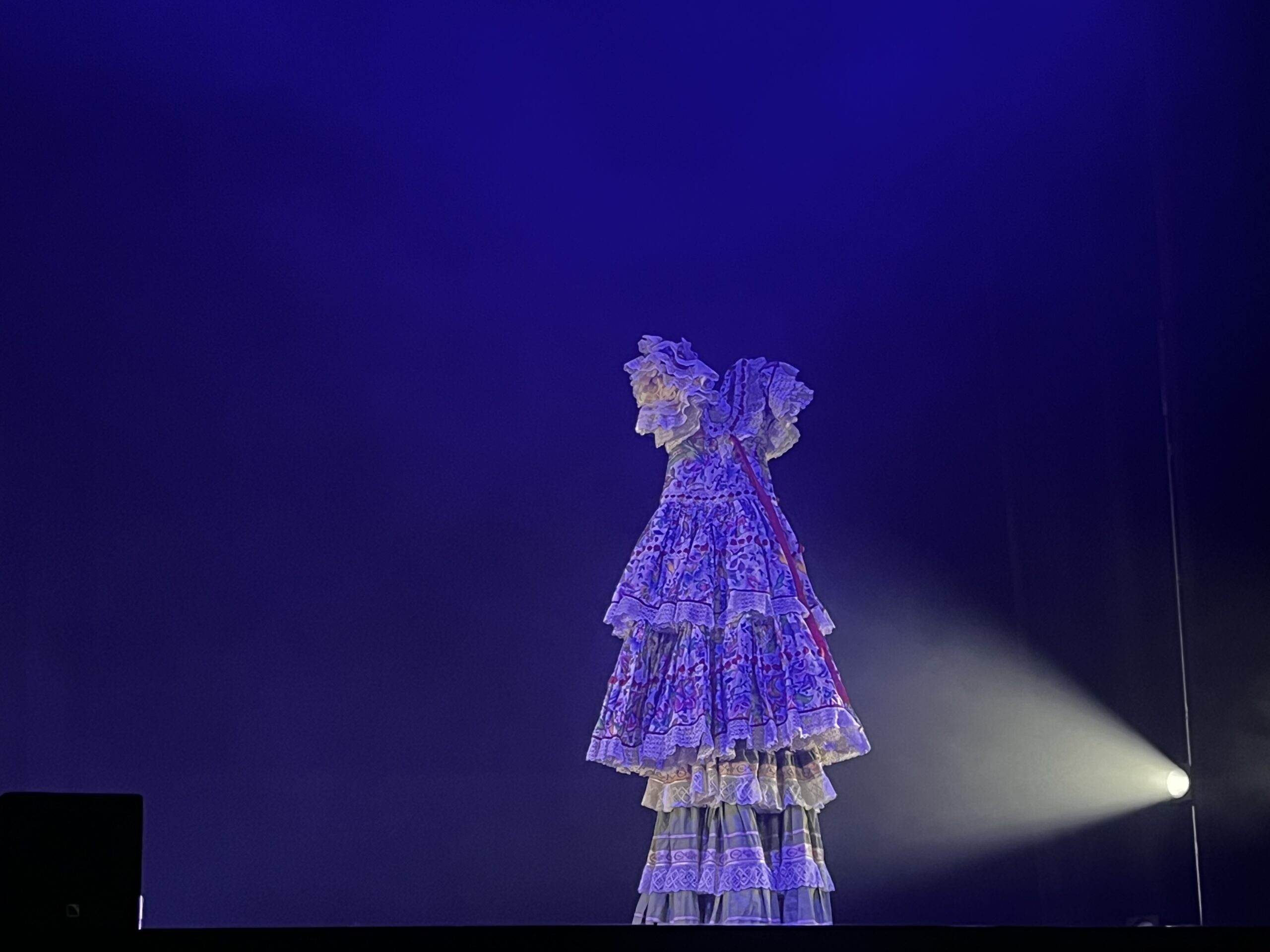 En uno de los momentos más simbólicos, la intérprete transforma su figura al cubrirse el rostro con una malla y colocarse un vestido que evoca la silueta de una virgen. A partir de ahí, desarrolla una secuencia de movimientos rígidos, casi mecánicos, acompañados de música folclórica que refuerza el carácter ritual del panorama.